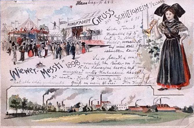 Sur cette carte, du Wiewer Messti (pour les malheureux qui ne parlent pas Alsacien ou qui ne connaissent pas la plus belle région du Monde : Messti c’est la foire et Wiewer c’est les Femmes), figure une attraction, des combats de Lutte.