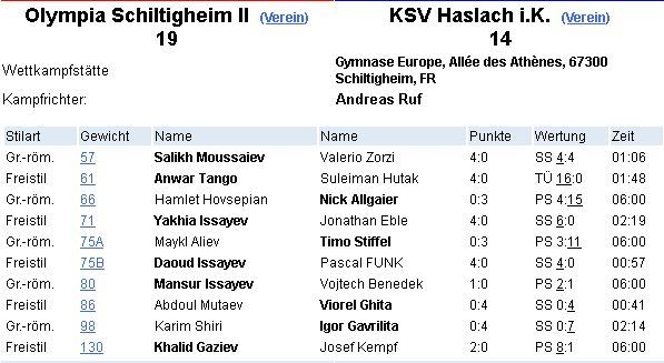 Une belle victoire pour l'Olympia lutte Schiltigheim 2 en battant le club d'Haslach 19 à 14. Cette victoire leur permet de se détacher, provisoirement des équipes qui risquent la relégation. Cela va peut-etre le relancer et qui sait...continuer dans la foulée avec d'autres victoires...