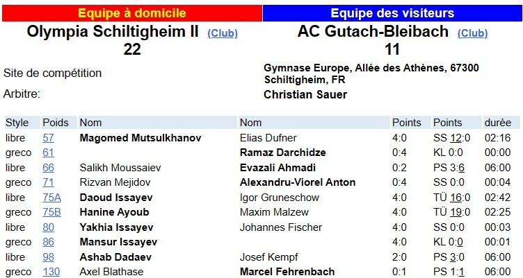 Pour cette deuxième rencontre l'Olympia Lutte Schiltigheim a décroché sa première victoire sur le score de 22 à 11.
